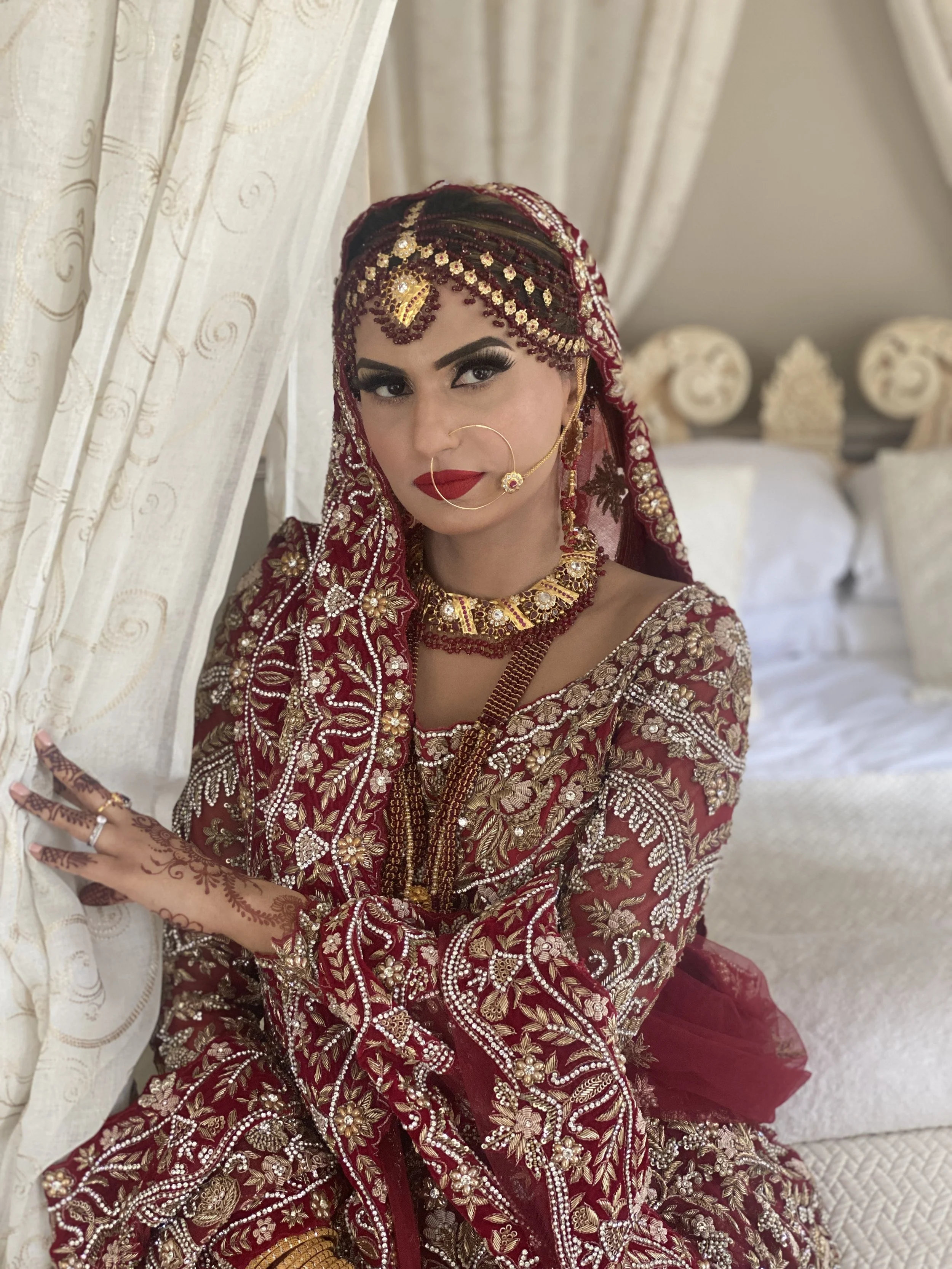 Our bridal service is a complete, tailored experience including consultation, bespoke hair and makeup, skin preparation, lashes, and final styling such as dupatta or veil setting. Additional services can be discussed during your enquiry.