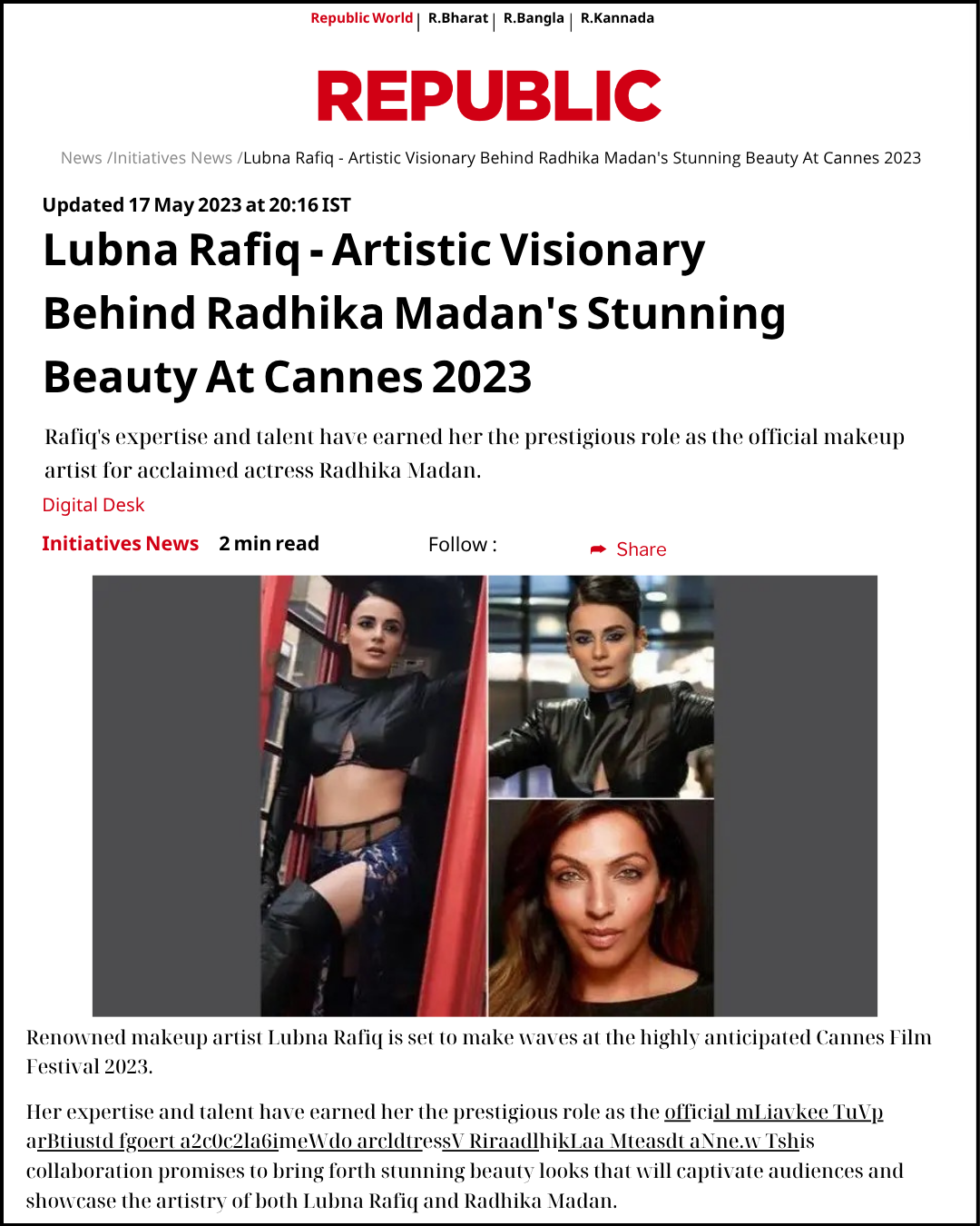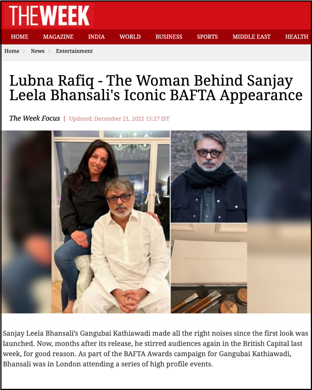 PRESS ARTICLES FEATURED Sanjay Leela Bhansali for THE WEEK Read More FEATURED Kubra Khan for THE LENS Read More FEATURED Lubna Rafiq for CHRONICLE Read More FEATURED Lubna Rafiq 20 Years for ASIANA Read More FEATURED Radhika Madan for REPUBLIC Read More